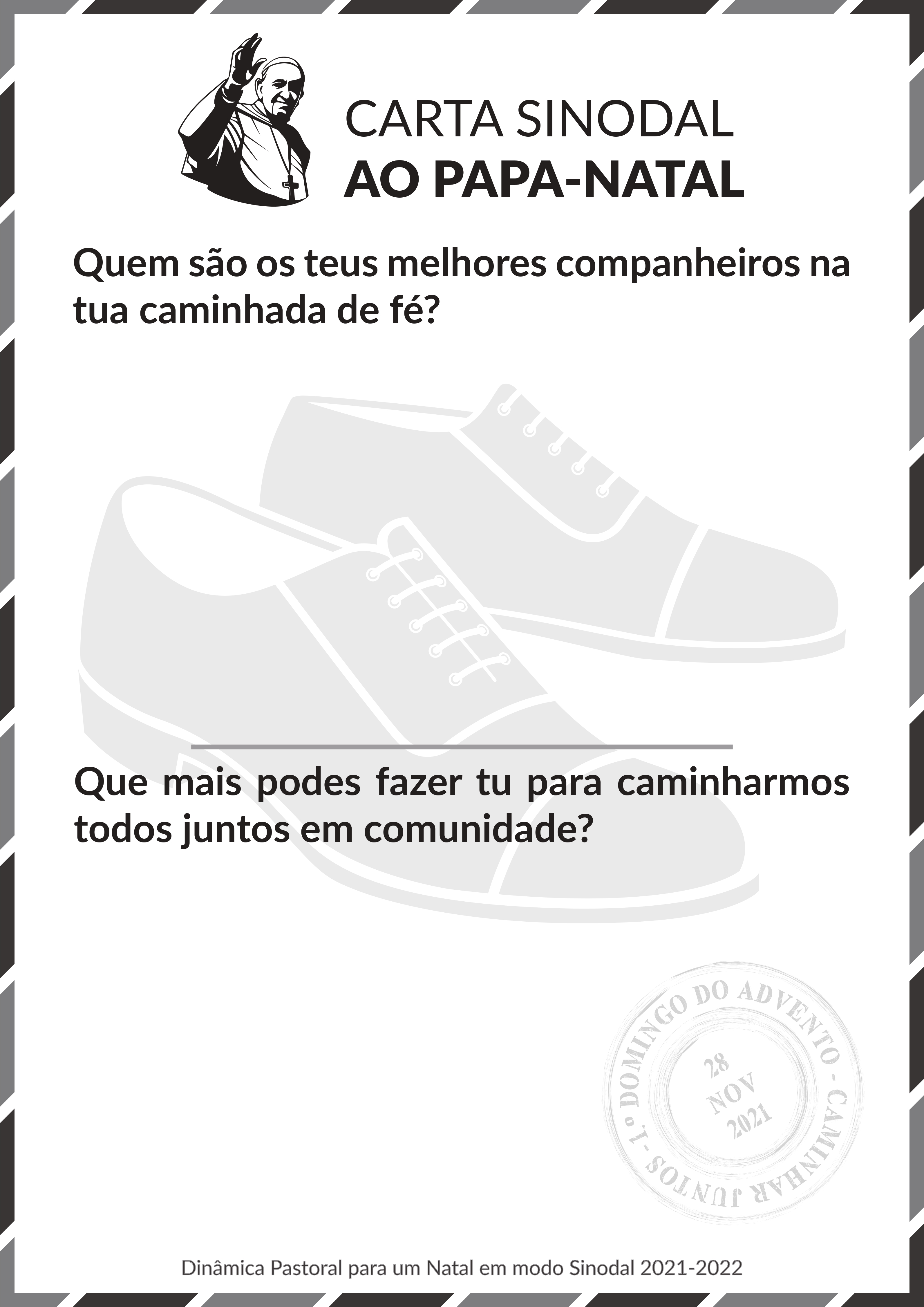 Irmãos e irmãs: coloquemos junto do presépio os sapatinhos de Natal. São uma espécie de cofre aberto dos nossos sonhos mais secretos. Somos desafiados, nesta 1.ª semana do Advento, a responder a duas perguntas sobre o nosso caminhar juntos em família e a escrever as respostas numa espécie de bilhete-postal, dirigido à nossa própria família, que designaremos idealmente por Família Natal. Coloquemos no sapatinho junto do Presépio os nossos sonhos para a família. E, nos sapatos grandes, que estão à entrada da nossa igreja, colocaremos as nossas respostas a duas perguntas semelhantes, sobre o que é isto de caminharmos juntos em Igreja. Essas respostas fazem parte de uma imaginária Carta ao Papa Natal.