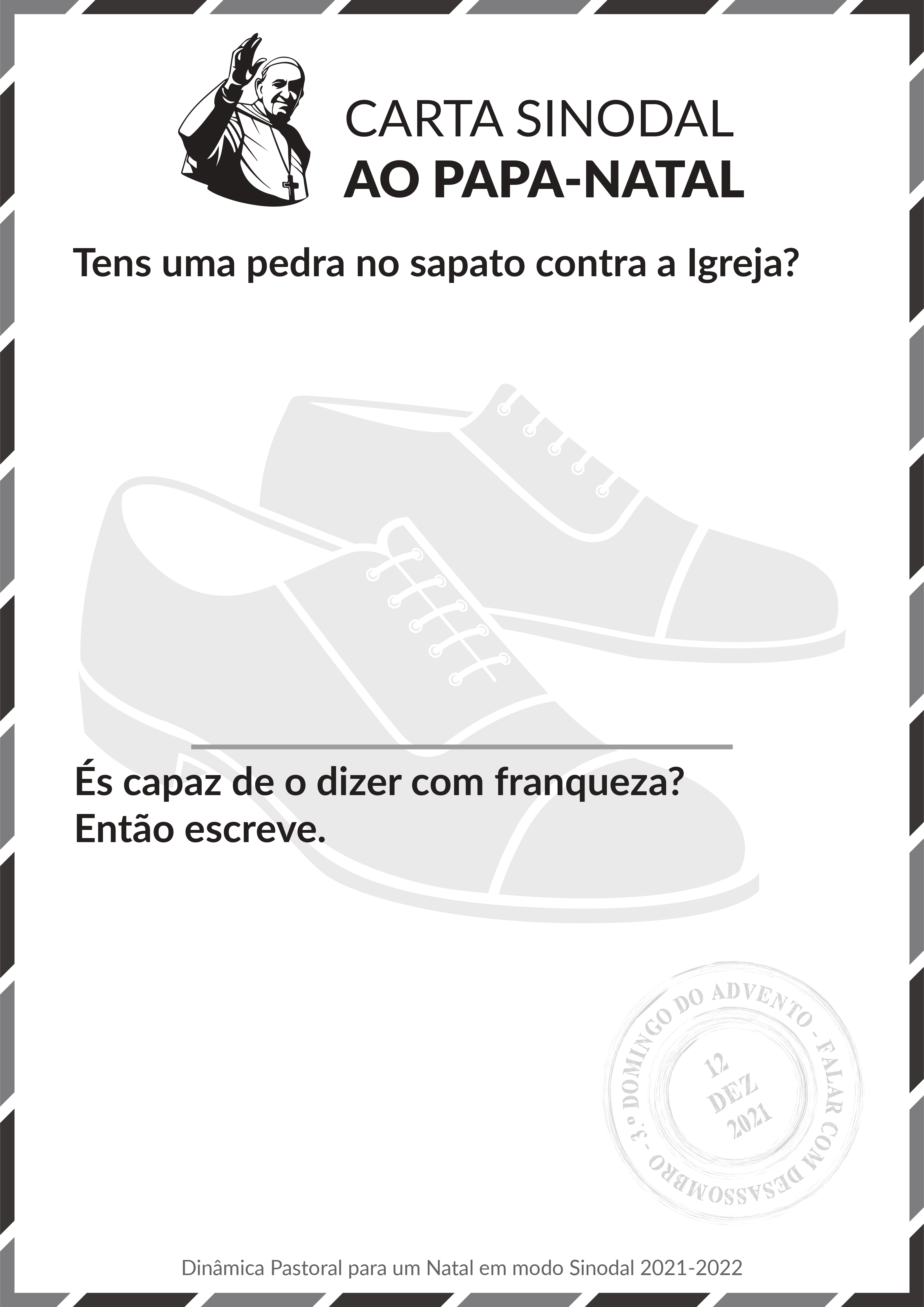 5. Com este espírito, responde:“Tens uma pedra no sapato contra alguém da tua família? És capaz de o dizer com franqueza? Então escreve” no teu Bilhete-postal à Família Natal. Na Carta Sinodal ao Papa Natal, alarga o teu coração à comunidade cristã e responde: “Tens uma pedra no sapato contra a Igreja? És capaz de o dizer com franqueza? Então escreve”. Escreve, em clima de oração, o que o Espírito Santo te diz ao coração e diz à Igreja por meio de ti. Falemos todos ao coração!
