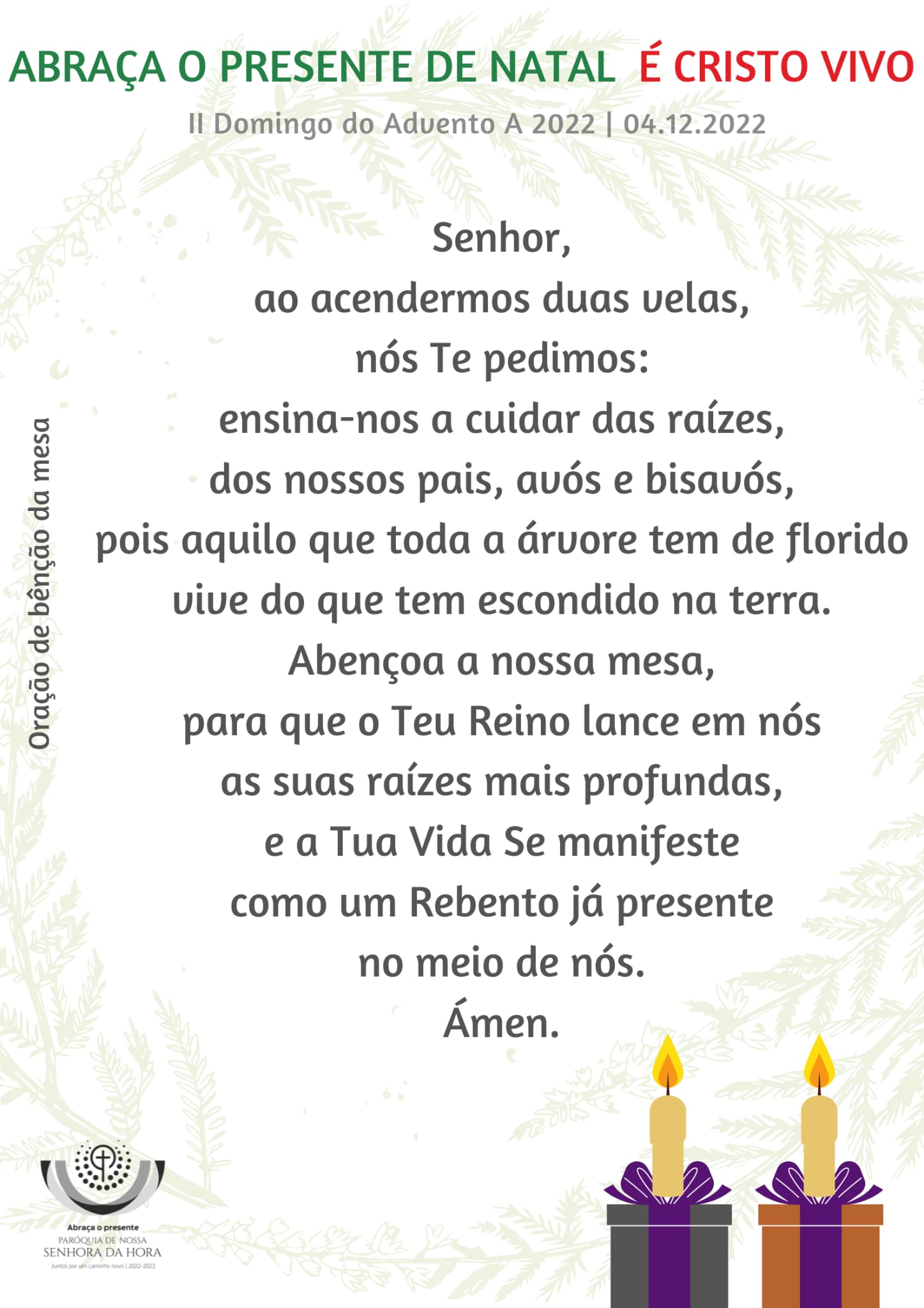 3. Na verdade, o que a árvore tem de florido vive sempre daquilo que tem escondido nas raízes, que penetram a terra. Se queremos ver a árvore da nossa vida florir e dar bons frutos, cuidemos das raízes. O presente, o dom do Amor de Deus, que agora se faz presente em Jesus Cristo, é também Ele um Rebento que é preciso acolher, abraçar, cuidar com amor, para que possa frutificar em nós. Por isso, o desafio desta 2.ª semana do advento é o de cuidarmos das nossas raízes. Só a partir daí podemos crescer, florescer e frutificar (cf. Ch.vivit, 182). Como são importantes as nossas raízes! Sentimo-lo especialmente junto da árvore e na Ceia de Natal. Mesmo quando essas raízes mergulham no silêncio fecundo da terra e frutificam já no Céu, elas continuam, ainda assim, a alimentar a nossa vida, de memórias, de referências, de exemplos, de ensinamentos, de sabedoria, de gestos, de ternura, de bênçãos.