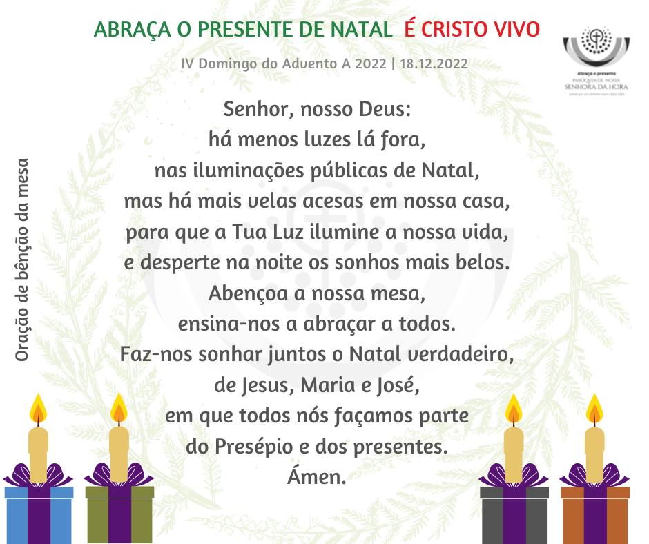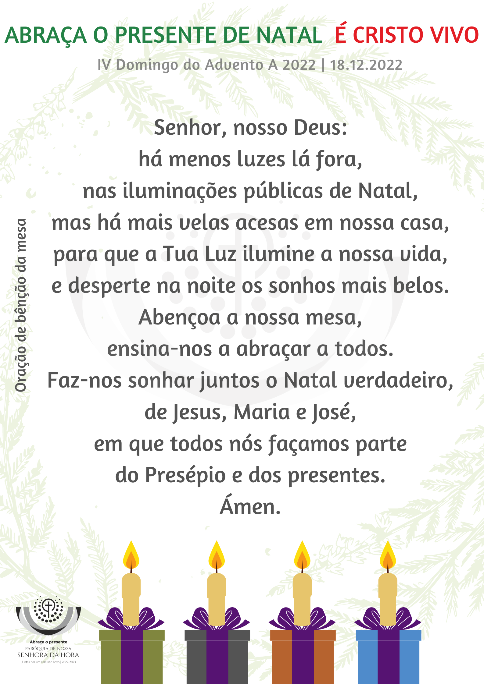 5. Irmão, irmã: o presente é um sonho! Ao longo desta semana, sonha e dá nome a estes quatro sonhos: um primeiro sonho, sobre o que mais gostarias de alcançar de Deus na tua vida pessoal; um segundo sonho, sobre a graça que mais anseias para a vida da tua família; um terceiro sonho, sobre o fruto mais belo que gostarias de ver crescer nesta tua comunidade; um quarto sonho, sobre o desejo mais ardente que acalentas para o nosso mundo. Coloca, sob a imagem de São José, estes quatro sonhos. E reza, levanta-te todos os dias, luta e sonha com todos, para abraçares o presente de Natal que é Cristo vivo. O presente é um sonho. Liberta a vida!
