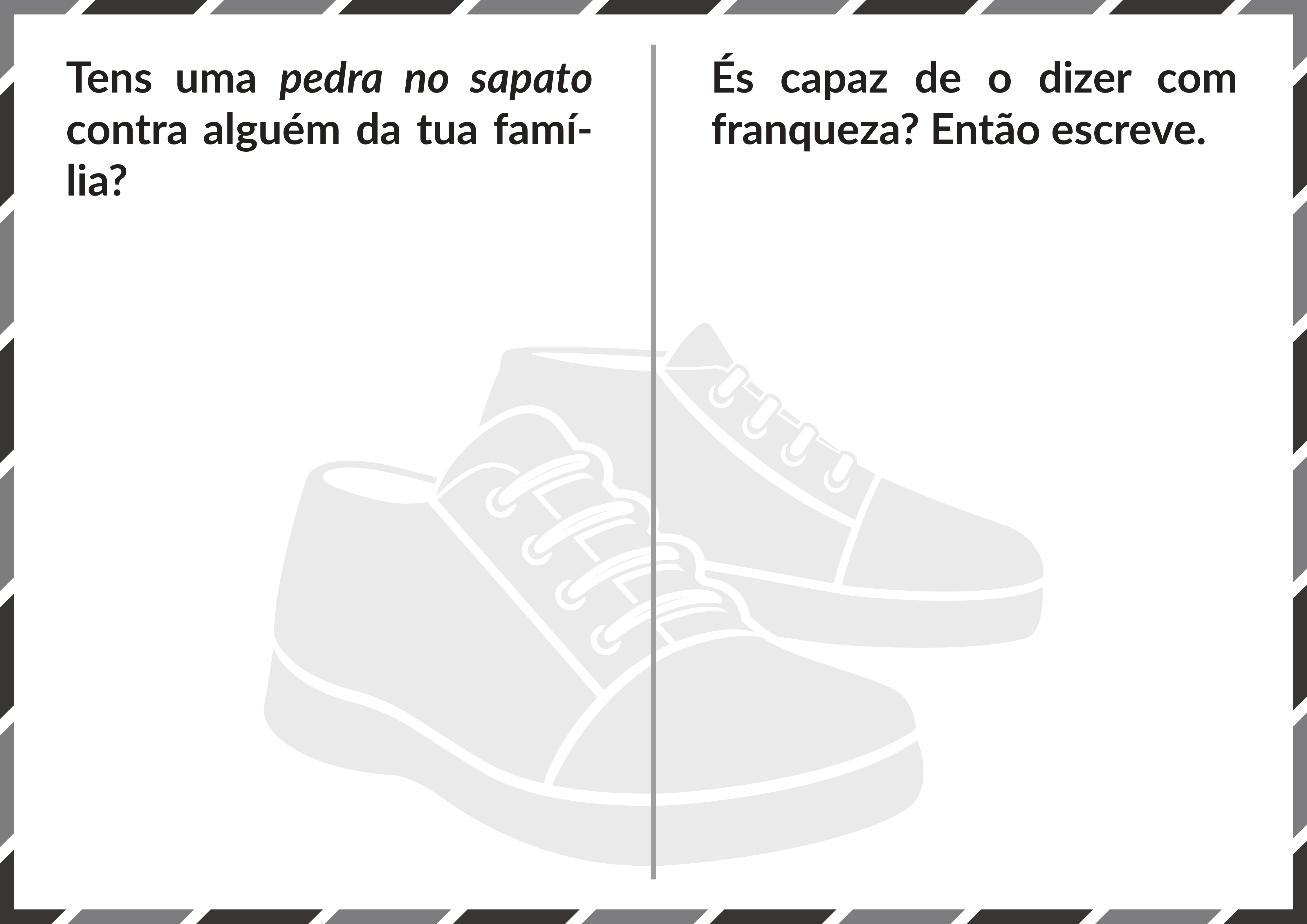 5. Com este espírito, responde:“Tens uma pedra no sapato contra alguém da tua família? És capaz de o dizer com franqueza? Então escreve” no teu Bilhete-postal à Família Natal. Na Carta Sinodal ao Papa Natal, alarga o teu coração à comunidade cristã e responde: “Tens uma pedra no sapato contra a Igreja? És capaz de o dizer com franqueza? Então escreve”. Escreve, em clima de oração, o que o Espírito Santo te diz ao coração e diz à Igreja por meio de ti. Falemos todos ao coração!