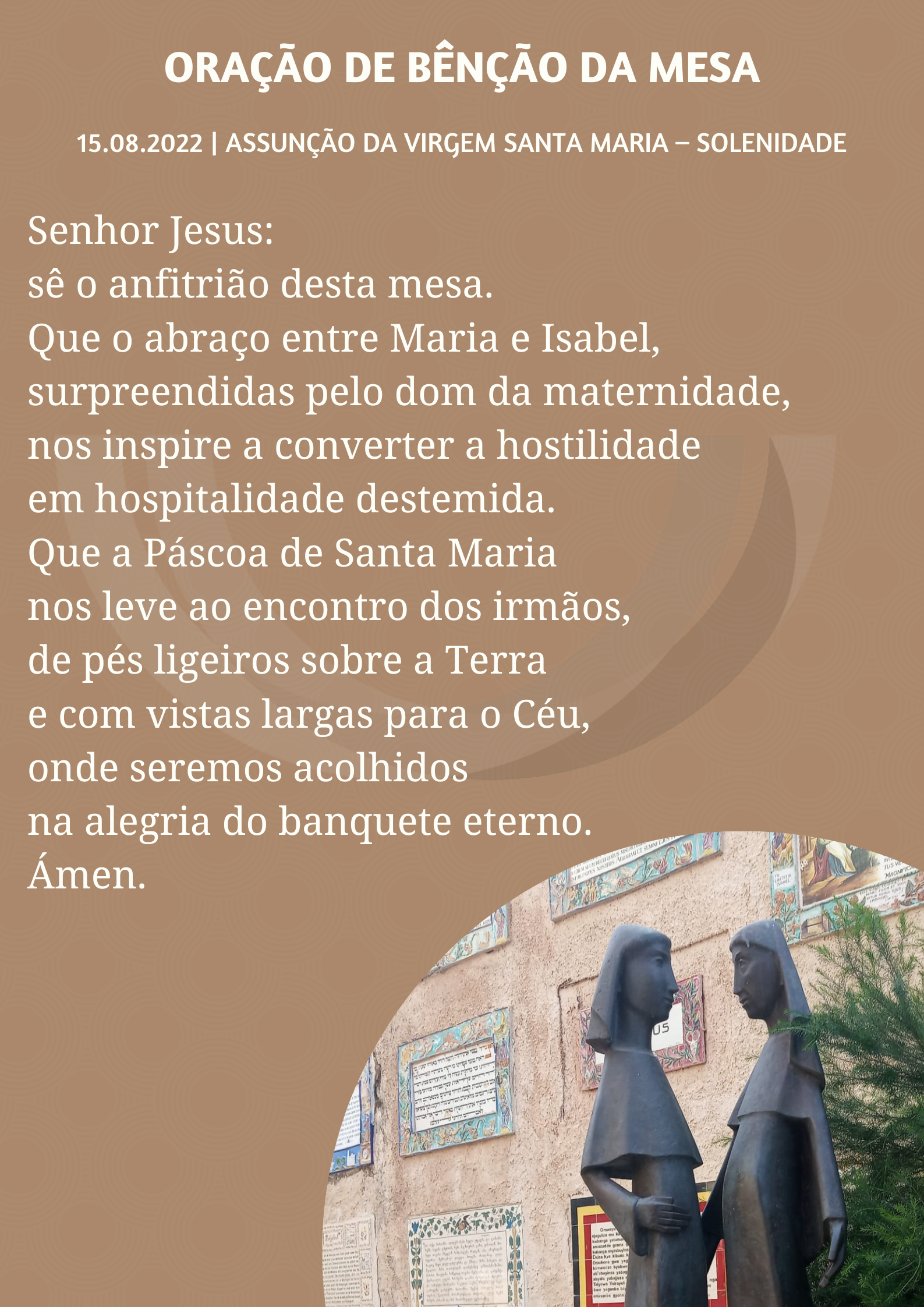 1. A cena bíblica da Visitação inspira a Jornada Mundial da Juventude, que se realizará, em Lisboa, de 1 a 6 de agosto de 2023. Previamente, de 24 a 31 de julho, nos chamados Dias da Diocese, seremos desafiados a acolher, num grande abraço de hospitalidade, em nossas casas, e comunidades eclesiais, milhares de jovens, vindos de todas as partes do mundo. Nós que vivemos este ano pastoral, imitando Maria, que Se levantou e Se pôs apressadamente a caminho, para sair ao encontro da prima Isabel, vivamos o novo ano pastoral de 2022-2023, inspirados pela saudação de Maria a Isabel, valorizando a hospitalidade, o acolhimento e a escuta ativa. Mantendo o propósito de avançar “Juntos por um caminho novo”, o desafio mariano específico para o novo ano pastoral é mesmo este: Abraça o presente!