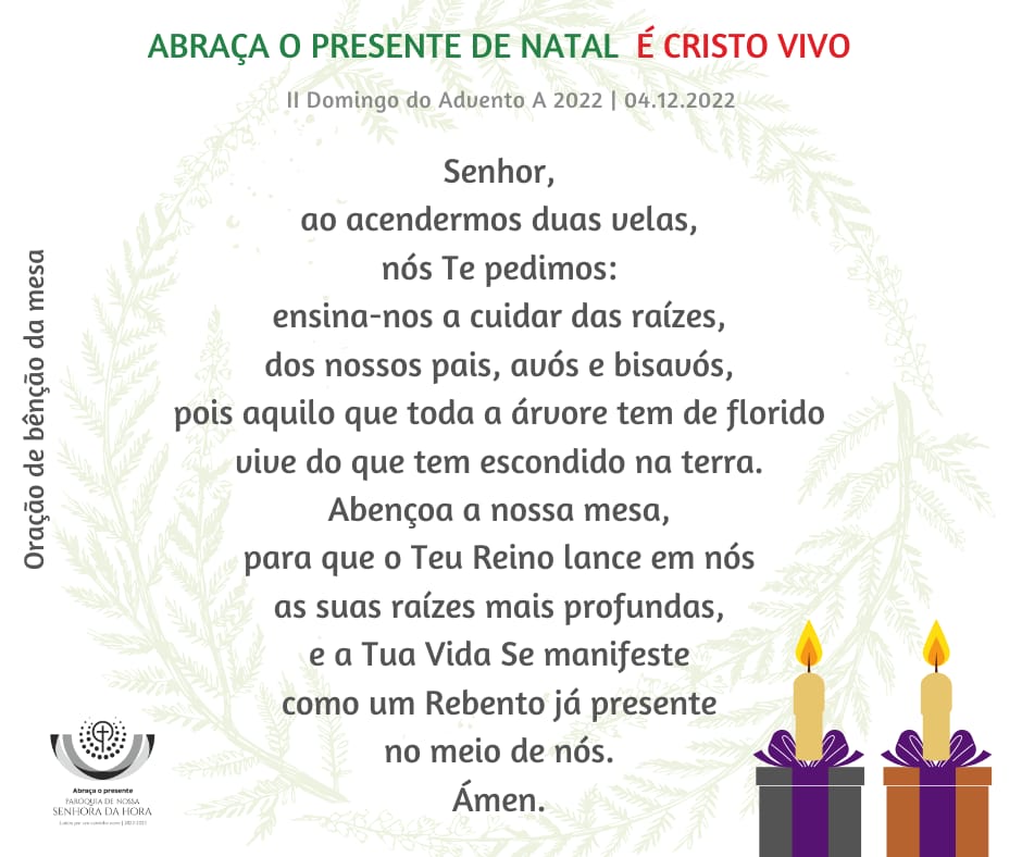 3. Na verdade, o que a árvore tem de florido vive sempre daquilo que tem escondido nas raízes, que penetram a terra. Se queremos ver a árvore da nossa vida florir e dar bons frutos, cuidemos das raízes. O presente, o dom do Amor de Deus, que agora se faz presente em Jesus Cristo, é também Ele um Rebento que é preciso acolher, abraçar, cuidar com amor, para que possa frutificar em nós. Por isso, o desafio desta 2.ª semana do advento é o de cuidarmos das nossas raízes. Só a partir daí podemos crescer, florescer e frutificar (cf. Ch.vivit, 182). Como são importantes as nossas raízes! Sentimo-lo especialmente junto da árvore e na Ceia de Natal. Mesmo quando essas raízes mergulham no silêncio fecundo da terra e frutificam já no Céu, elas continuam, ainda assim, a alimentar a nossa vida, de memórias, de referências, de exemplos, de ensinamentos, de sabedoria, de gestos, de ternura, de bênçãos.