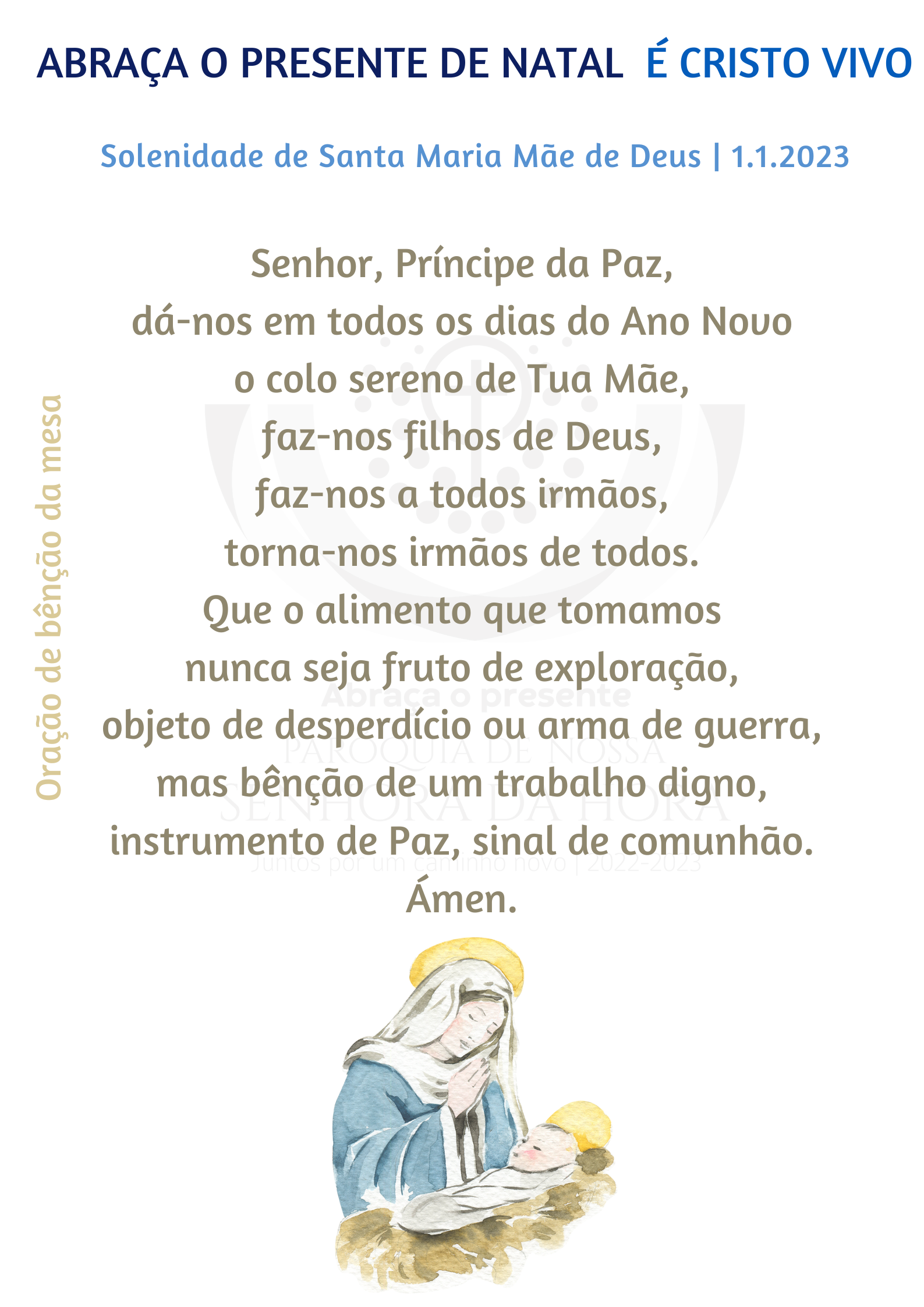 Santa Mãe de Deus, nós Te consagramos o Ano Novo de 2023. Tu, que sabes guardar todas as coisas no Teu coração, abraça-nos e cuida de nós em todo o tempo. Abençoa o tempo presente e ensina-nos a encontrar tempo para Deus e para os outros. Dá-nos a boa pressa dos teus passos, para sairmos, com todo o tempo do mundo, ao encontro de quem mais precisa. Santa Mãe de Deus, cuida especialmente dos jovens, que são o agora de Deus, com os seus sonhos e anseios, para que recomecem a despertar e a abrir as suas asas e reencontrem o sabor de voar alto.Mãe do Príncipe da Paz, faz-nos acreditar e esperar que sobre o ódio vença o amor, sobre a mentira prevaleça a verdade, sobre a ofensa vença o perdão, sobre a guerra prevaleça a paz. Assim seja!