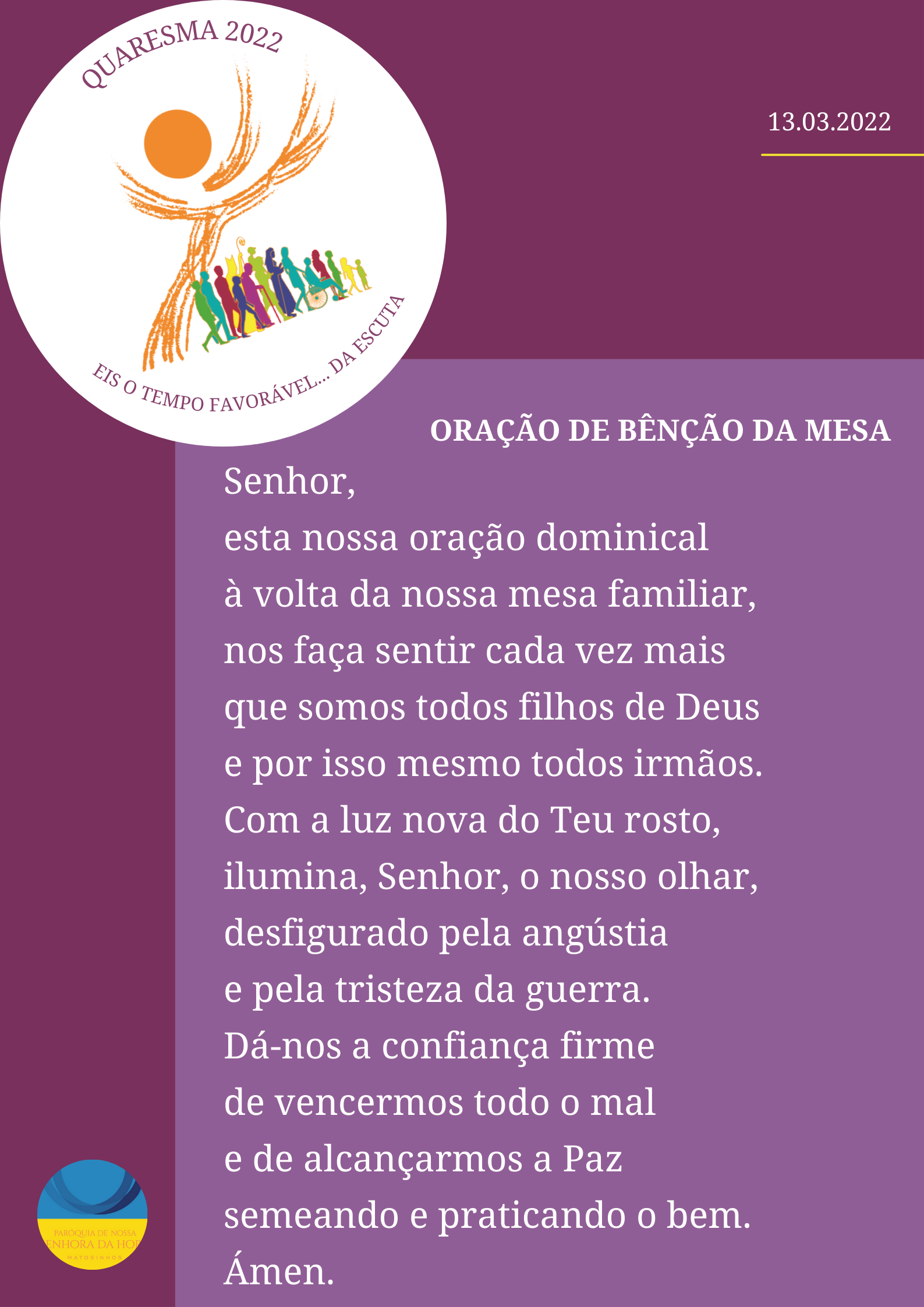 4. Irmãos e irmãs: nesta Quaresma, e em tempo de guerra, rezemos mais, rezemos sempre, sem o cessar-fogo do Espírito; usemos a arma da oração, essa tão poderosa arma que nos desarma o coração! E oremos, a partir de um belo Hino da Liturgia das Horas: