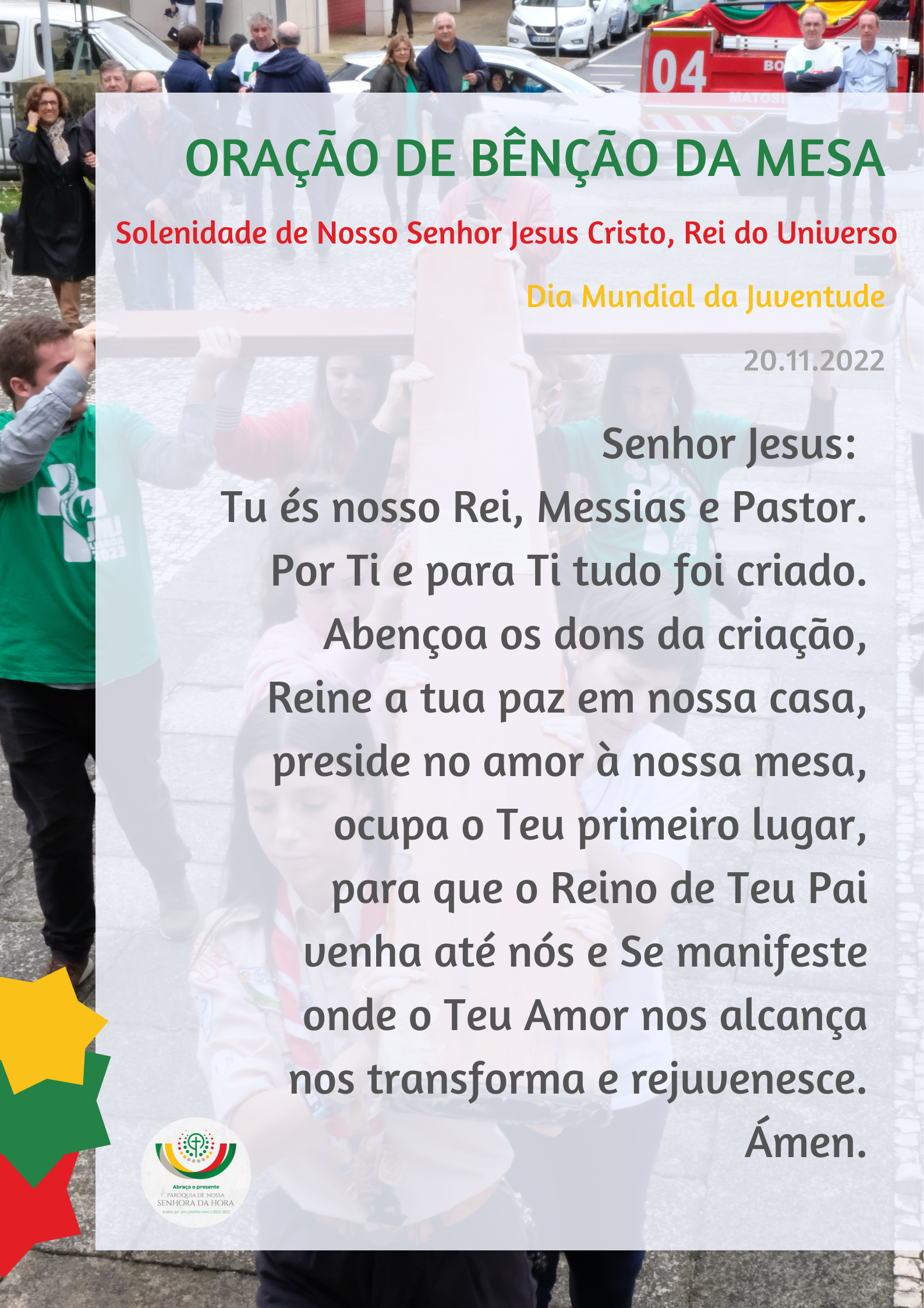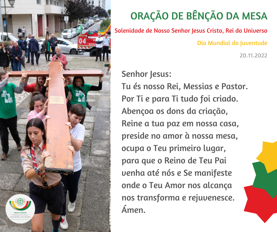 2. Neste dia da Solenidade de Nosso Senhor Jesus Cristo Rei do Universo e neste Dia Mundial da Juventude, com o presente da vida eterna, abracemos ainda dois presentes muito especiais: o Reino de Deus e os jovens a caminho da JMJ.