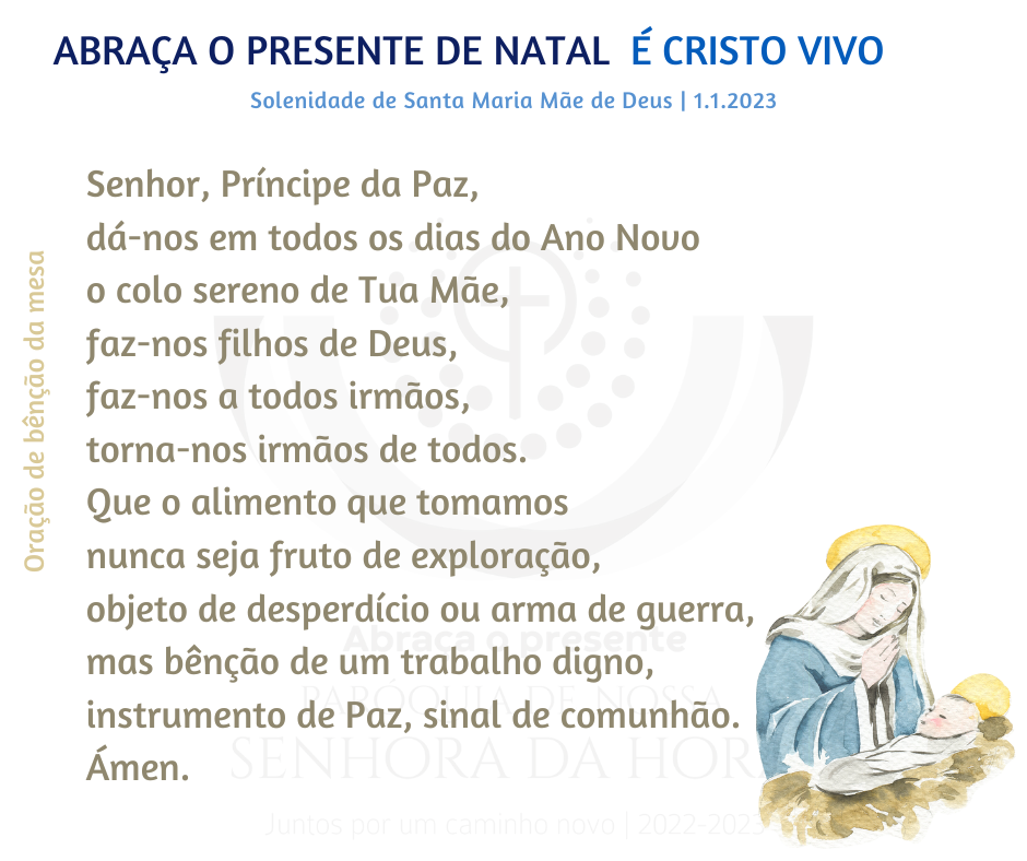 Santa Mãe de Deus, nós Te consagramos o Ano Novo de 2023. Tu, que sabes guardar todas as coisas no Teu coração, abraça-nos e cuida de nós em todo o tempo. Abençoa o tempo presente e ensina-nos a encontrar tempo para Deus e para os outros. Dá-nos a boa pressa dos teus passos, para sairmos, com todo o tempo do mundo, ao encontro de quem mais precisa. Santa Mãe de Deus, cuida especialmente dos jovens, que são o agora de Deus, com os seus sonhos e anseios, para que recomecem a despertar e a abrir as suas asas e reencontrem o sabor de voar alto.Mãe do Príncipe da Paz, faz-nos acreditar e esperar que sobre o ódio vença o amor, sobre a mentira prevaleça a verdade, sobre a ofensa vença o perdão, sobre a guerra prevaleça a paz. Assim seja!