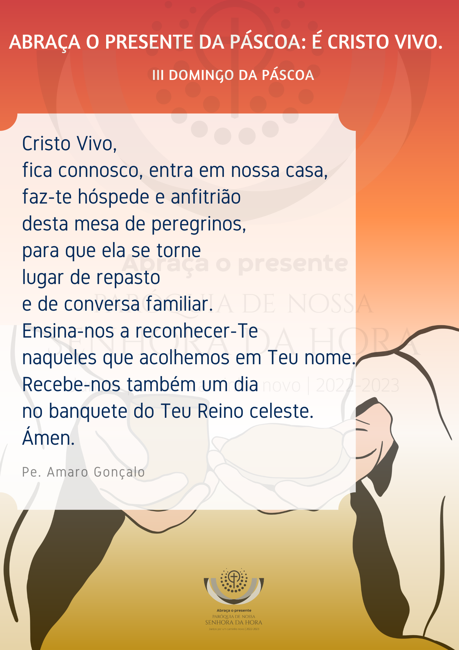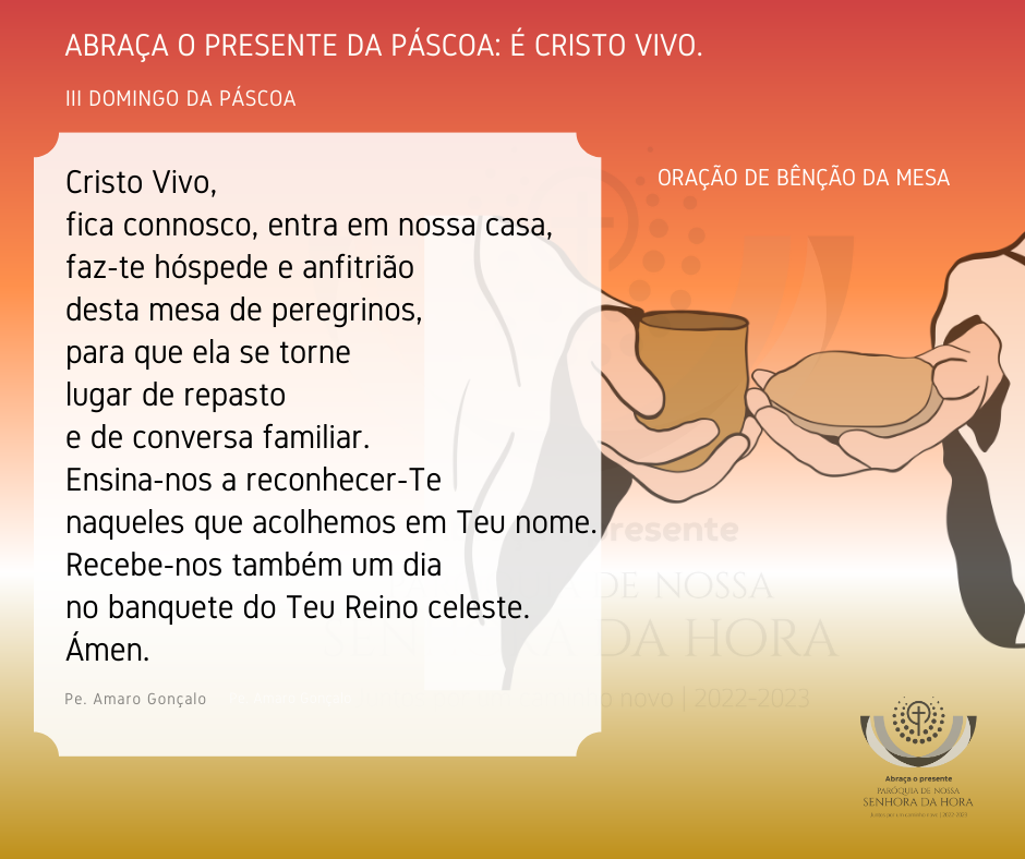 3. Compartilhar!Não desertemos de participar na comunidade cristã. Se queremos encontrar Jesus,não O procuremos mais fora de nós e da comunidade. Façamos comunidade, compartilhemos juntos as dúvidas e os medos, as alegrias e as esperanças, o Pão da Palavra e o Pão da Vida. Fora da comunidade, é difícil encontrar Jesus!Perguntemo-nos, então, por fim:Onde procuramos o Ressuscitado? Em algum acontecimento especial ou espetacular? Nas nossas emoções e sensações? Ou na comunidade cristã, aceitando o desafio de permanecer na Igreja, mesmo que esta não seja perfeita (cf. Papa Francisco, Regina Caeli, 16.4.2023)!