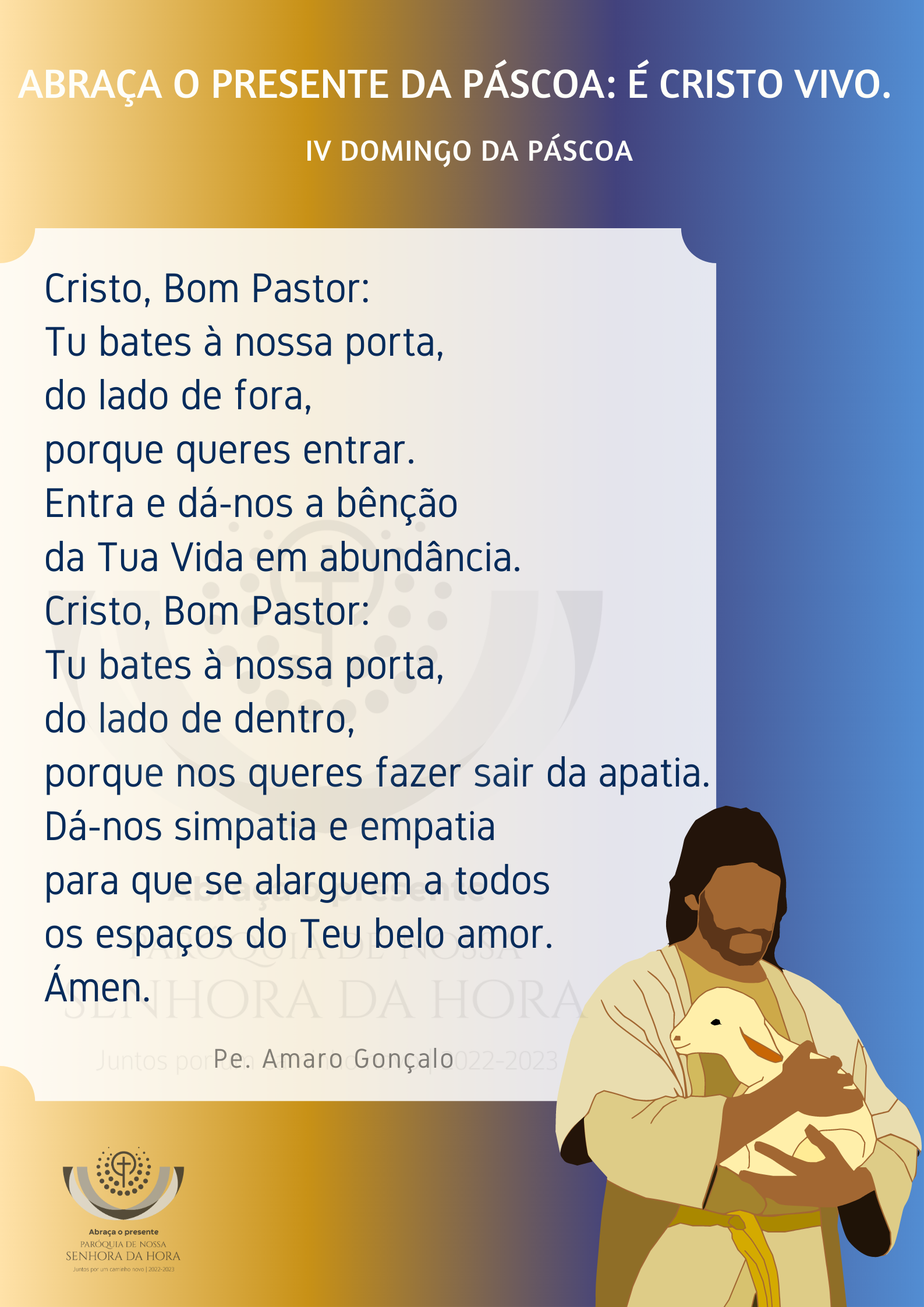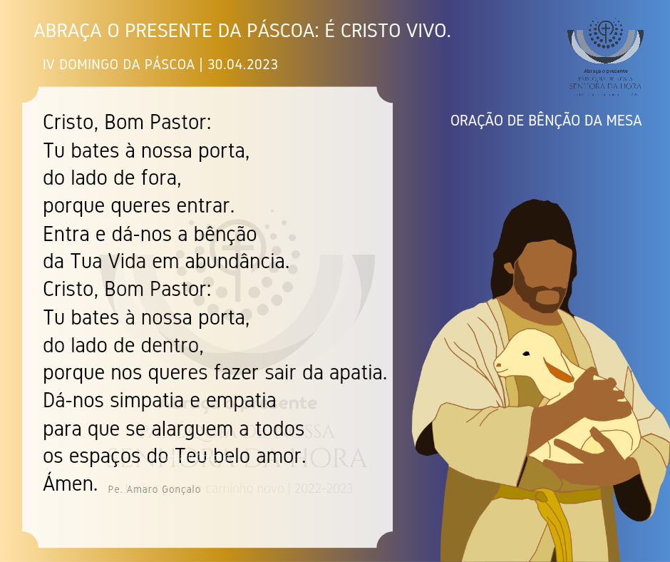 Irmão e irmã: pede a graça de reconheceres e de seguires a voz do Bom Pastor. Eis que Ele está à tua porta e bate: se ouvires a Sua voz e lhe abrires a porta, entrará, ceará contigo e tu cearás com Ele (cf. Ap 3,20). Ele bate à tua porta, do lado de fora para entrar, e bate à tua porta desde o lado de dentro para te fazer sair do egoísmo e te conduzir aos pastos da verdadeira liberdade! Escuta e segue a Sua Voz!