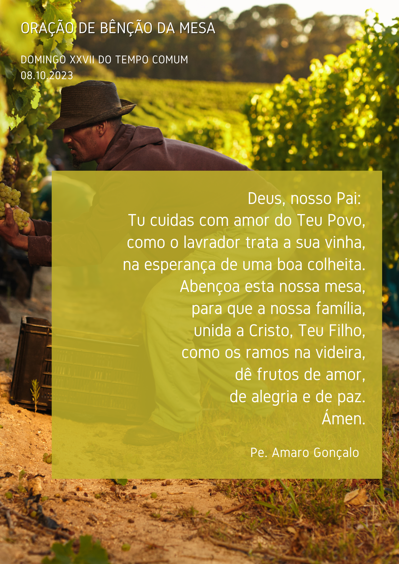 3.º: Tal como no trabalho da vinha, a nossa missão é um serviço realizado em clima de alegria e de festa. Não podemos olhar para a Catequese, para a Eucaristia, para a vida e para o trabalho em comunidade, como um fardo, uma obrigação, um peso, uma tortura, uma penitência, mas como uma graça, uma oportunidade, uma chance, uma fonte de alegria. Eis por que o nosso Plano Diocesano de Pastoral insiste nesta marca da alegria. Irmãos e irmãs: escutemos o convite do Senhor: “Ide para a minha vinha”, “Filho, vai para a minha vinha”, “Ide e frutificai”. E que a nossa resposta seja esta: “Vamos com alegria. Juntos por um caminho novo”. Com este lema pastoral, apresentemo-nos diante de Deus e apresentemo-nos uns aos outros, como servidores da alegria e humildes trabalhadores da vinha do Senhor!